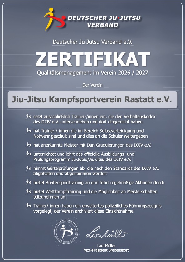 Dem Jiu-Jitsu Kampfsportverein Rastatt e.V. wurde das Zertifikat für Qualitätsmanagement des Deutschen Ju-Jutsu Verbandes e.V. (DJJV) erhalten hat. Diese Auszeichnung gilt für die Jahre 2026 und 2027 und bestätigt unser kontinuierliches Engagement für höchste Standards im Kampfsport.